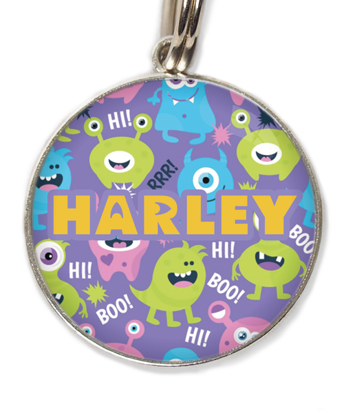 “Monster 2” – Huisdierpenning met monsters op de achtergrond. Kan gepersonaliseerd worden met naam of telefoonnummer aan de voorkant, of eender welke tekst. Verdere personalisatie aan de achterkant.